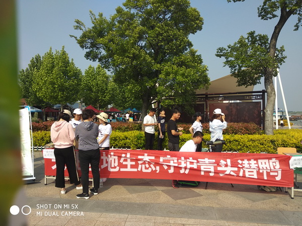 本次活动以“关爱野生鸟类,守护绿水青山”为主题。曲阜师范大学观鸟协会成员组织发放了关于青头潜鸭的台历及宣传折页,并向游客科普青头潜鸭的相关知识,对极危物种青头潜鸭进行保护宣传。