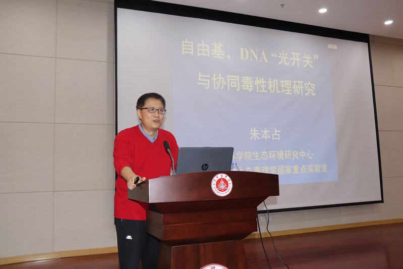 朱本占研究员以“DNA光开关与协同作用”为题,深入浅出地阐述了自由基的形成机制、钌盐复合物的“DNA光开关”的分子机制及光动力治疗肿瘤等研究的最新进展。报告最后,朱本占研究员还同师生们分享了他自己的和医学著名科学家的科研心得与体会,并同与会者进行了热烈坦诚的交流。