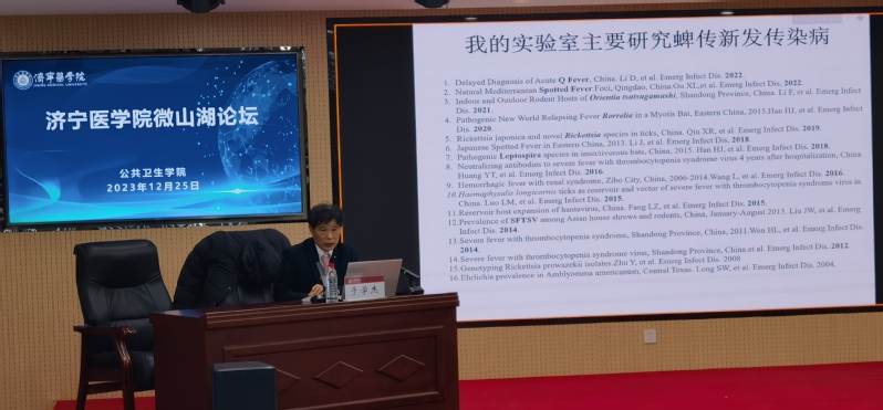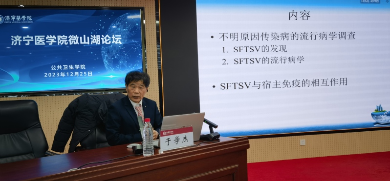 12月25日,由必赢73882登录网址主办的济宁医学院微山湖论坛在太白湖校区举行,著名流行病与统计学专家、国家千人计划特聘专家、武汉大学必赢73882登录网址于学杰教授受邀做题为“发热伴血小板减少综合征病毒流行病学和宿主免疫逃逸机制”的学术报告。学院党总支书记卫明武出席活动。本次论坛由必赢73882登录网址院长林立主持。