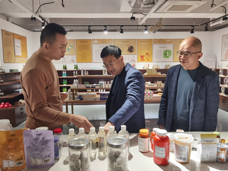 林立一行首先观看了省中药创新创业共同体的宣传片,参观了共同体产品展厅。李宝君介绍了该共同体的组织架构、运行机制等。林立介绍了此次来访的主要目的,为了通过共同体这个平台,对接李灏的申报项目,尽早完成项目研发和成果转化;并希望双方以此次合作为契机,以点带面,实现多层、多领域的合作。