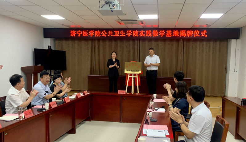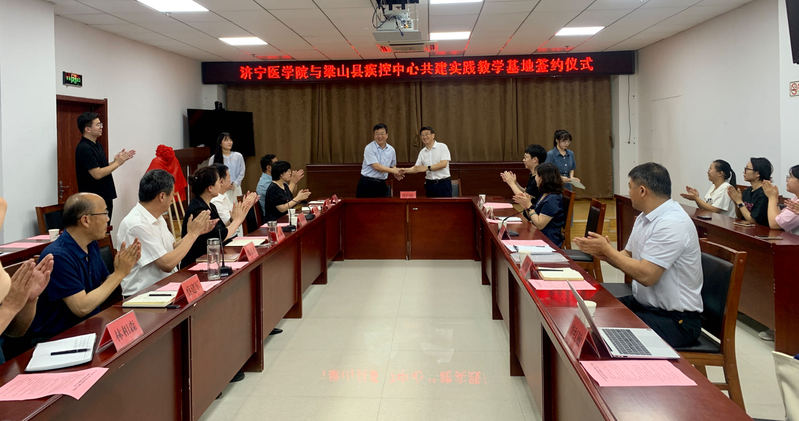 林立、丁俭代表双方签署《济宁医学院与梁山县疾病预防控制中心共建实践教学基地协议书》;卫明武、牛梅代表双方为济宁医学院实践教学基地揭牌。