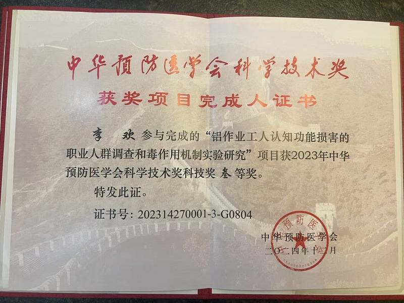 近日获悉,我院教师李欢在国内访学期间,与山西医科大学牛侨教授科研团队合作完成的“铝作业工人认知功能损害的职业人群调查和毒作用机制实验研究”项目,获2023年中华预防医学会科学技术奖科技奖三等奖。