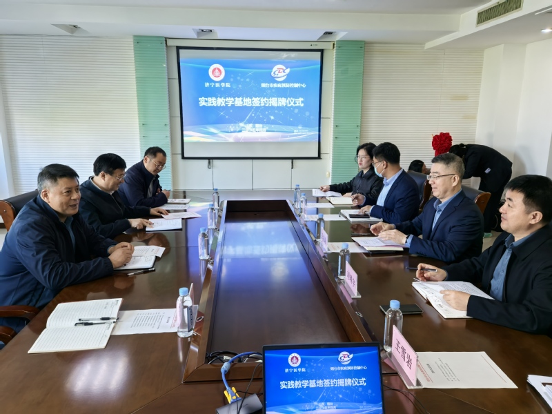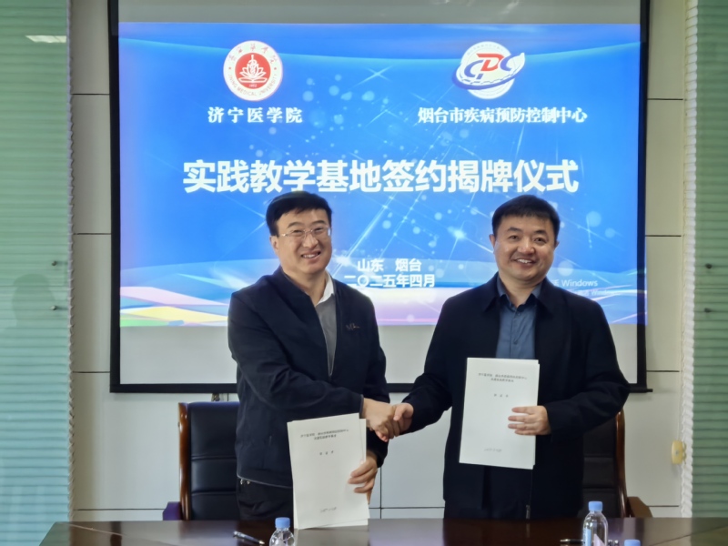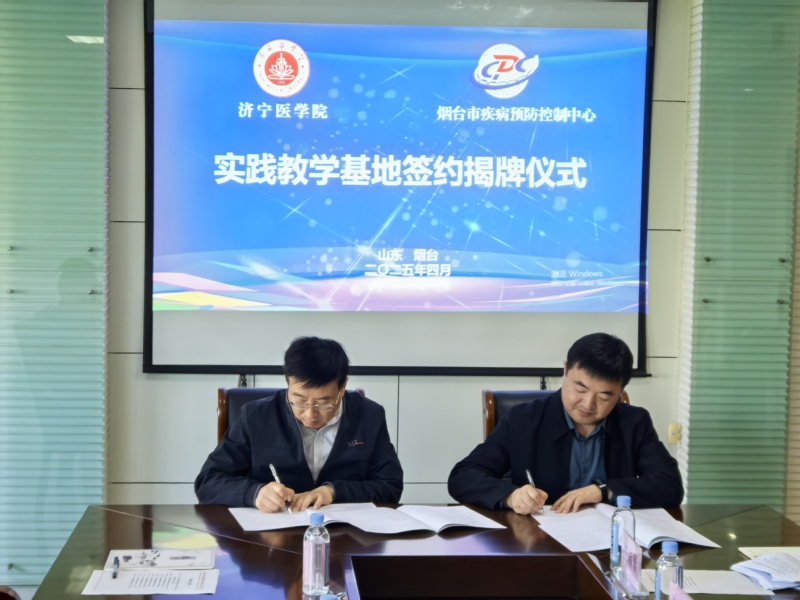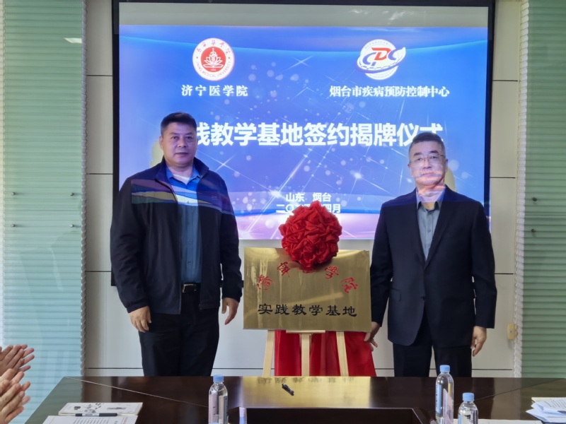 林立、刘靖宇代表双方共同签署《济宁医学院与烟台市疾病预防控制中心共建实践教学基地协议书》;卫明武、王洪涛为实践教学基地牌匾揭牌。